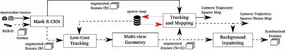 对于RGB-D相机而言,将RGB-D数据传入到CNN网络中对有先验动态性质的物体如行人和车辆进行逐像素的分割。作者使用多视几何在两方面提升动态内容的分割效果。首先作者对CNN输出的动态物体的分割结果进行修缮;其次,将在大多数时间中保持静止的、新出现的动态对象进行标注。对于单目和双目相机,则直接将图像传入CNN中进行分割,将具有先验动态信息的物体分割出去,仅使用剩下的图像进行跟踪和建图处理。