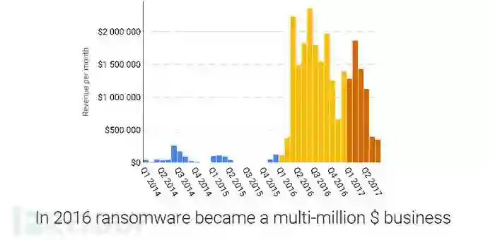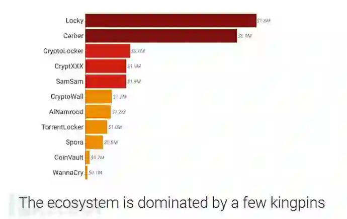 研究结果显示,2016 年是勒索软件收获最多的一年。每个月勒索软件赎金支付平均超过 100 万美元,有两个月甚至超过了 200 万美元。而最赚钱的两个勒索程序家族分别是 Locky 和 Cerber 。Locky 的成功和 Necurs 垃圾信息僵尸网络是分不开的,同时它还采用 RaaS 服务的方式,攻击者根本不需要多少技术知识,就能用上 Locky。谷歌的研究显示,Locky 赚到 780 万美元。排在第二的 Cerber 则赚了 690 万美元。更多研究内容可点击原文查看。