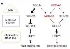 因此,RGBA-1-NPR-28信号是通过调节UPRmt的活性发挥作用。此外,不同线虫虫株中UPRmt的活性有所不同,暗示着UPRmt是衰老速度的关键调节因子。