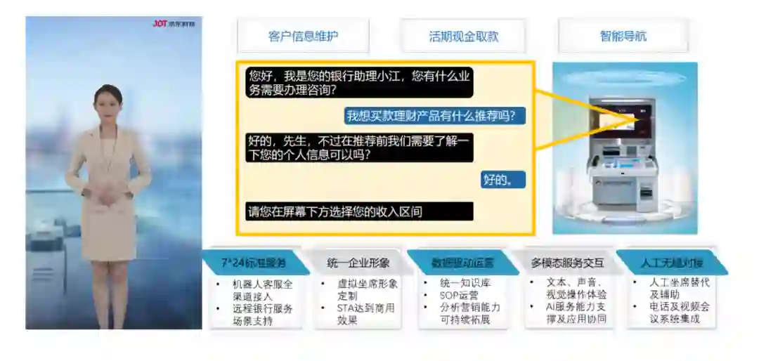 除京东内部应用之外,这些获得国际学术界顶尖荣誉的领先技术正在通过京东云这个统一平台输出对外赋能各行各业。比如,基于多模态交互数字人技术研发的“虚拟数字人”能助力京东云智能客服产品提升智能接待、服务和虚拟助手的体验。比如,京东云智能客服业务与某银行合作,打造了全国第一个交互式数字人项目“数字柜员”,有别于播报式数字人,“数字柜员”涉及VTM虚拟坐席交互,利用AI技术,实现用虚拟人替代真人柜员办理业务、把控风险。