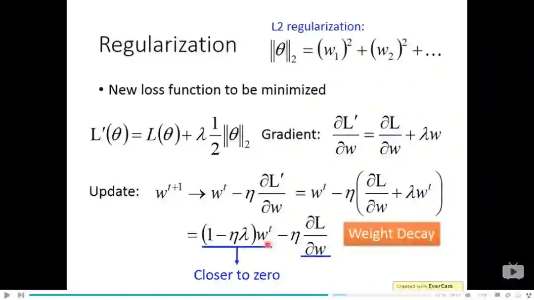 下图最下面左边一项的系数是略小于1的值,使得w越来越趋近于0,但最下面右边一项使得其平衡,总的作用就是weight decay