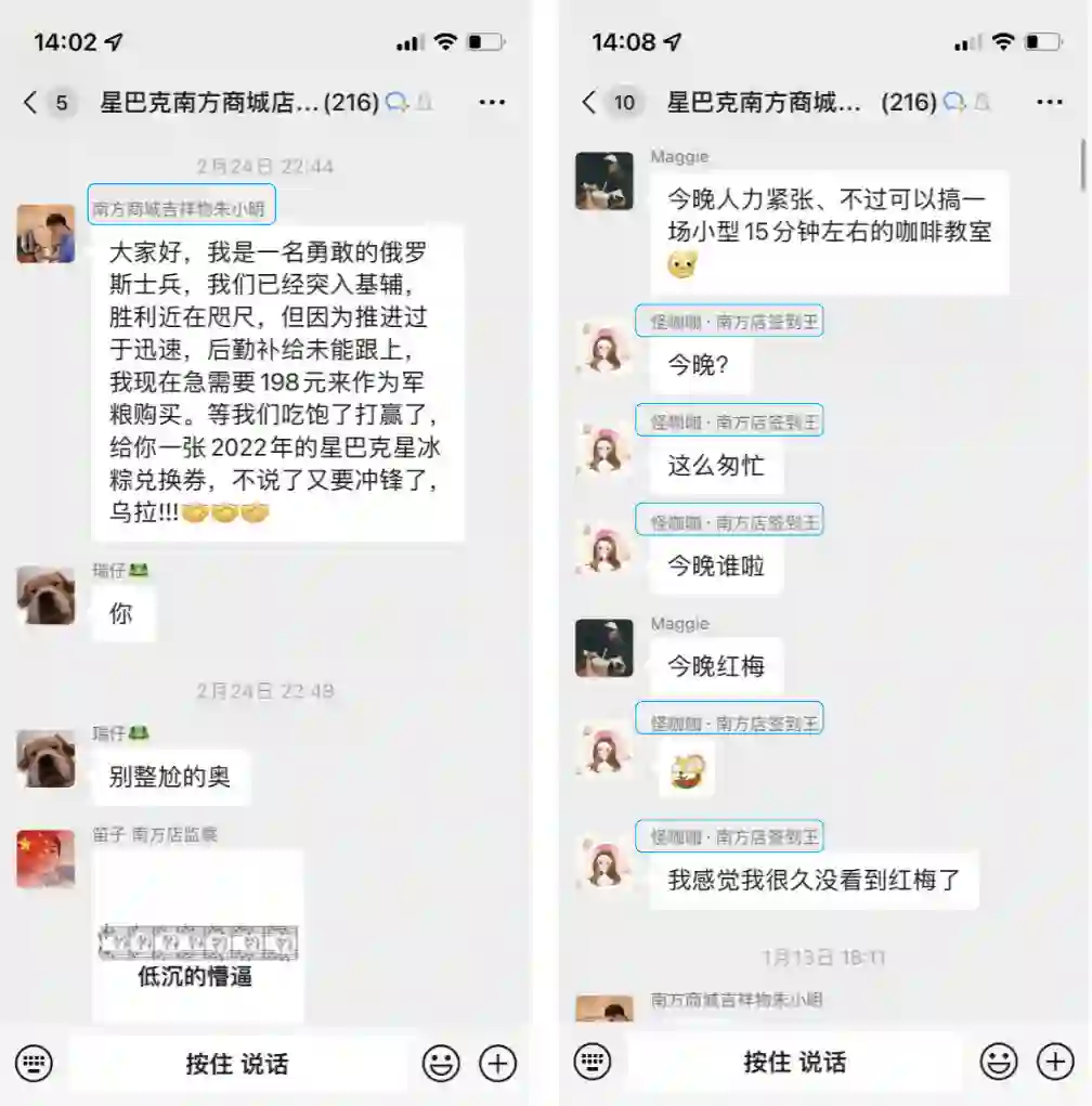 咖啡师在上班空余时间,也会在群内以朋友、挚友视角,与大家交流、互动,玩在一起,甚至彼此扮演着多重身份角色。