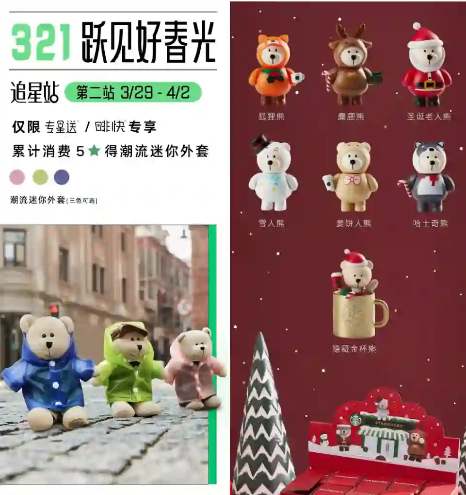 只送不卖,严格控制产出,打造稀缺性。用户必须在规定时间内消费集齐星才可获得,增加对熊店长、品牌的归属感。