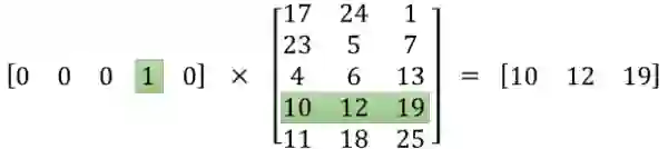我们来看一下上图中的矩阵运算,左边分别是1 x 5和5 x 3的矩阵,结果应该是1 x 3的矩阵,按照矩阵乘法的规则,结果的第一行第一列元素为0 x 17 + 0 x 23 + 0 x 4 + 1 x 10 + 0 x 11 = 10,同理可得其余两个元素为12,19。如果10000个维度的矩阵采用这样的计算方式是十分低效的。