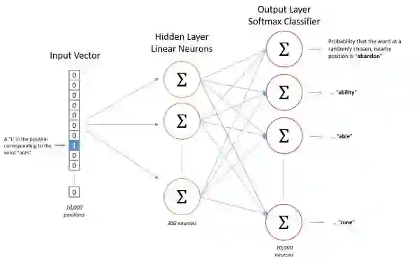 假设从我们的训练文档中抽取出10000个唯一不重复的单词组成词汇表。我们对这10000个单词进行one-hot编码,得到的每个单词都是一个10000维的向量,向量每个维度的值只有0或者1,假如单词ants在词汇表中的出现位置为第3个,那么ants的向量就是一个第三维度取值为1,其他维都为0的10000维的向量(ants=[0, 0, 1, 0, ..., 0])。