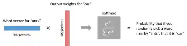 经过神经网络隐层的计算,ants这个词会从一个1 x 10000的向量变成1 x 300的向量,再被输入到输出层。输出层是一个softmax回归分类器,它的每个结点将会输出一个0-1之间的值(概率),这些所有输出层神经元结点的概率之和为1。