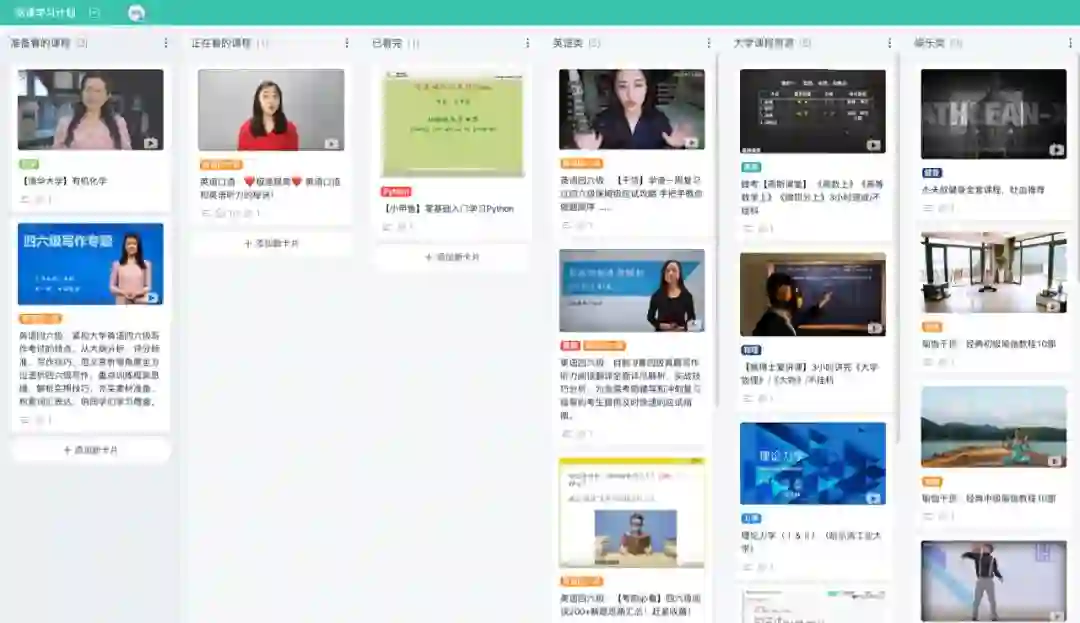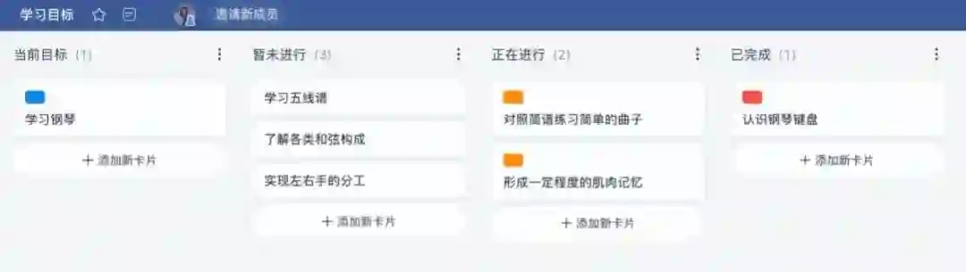 人类总渴望进步,我们有时会想要学习一种乐器、掌握一门编程语言……但这往往都是一些大而宽泛的任务,比如我的 Things 里就记录了「学习钢琴」「学习 Swift」等任务,但一直不知从何下手。但在板栗看板中,你可以让自己逐渐学会拆分学习目标,并督促自己完成目标。板栗看板可以用作 to do list,比如我创建了一个「学习目标」看板,把「学习钢琴」等目标拆分成多张任务卡片,然后将列表做成「未进行」「正在进行」和「已完成」三个主要阶段,安排自己的学习进程。学习目标 这样一来,我既可以通过看板来查看自己还有哪些学习任务没有完成,也可以时刻追踪自己的学习进度。得益于标签系统,我可以对每张卡片的重要性一目了然。我也会将自己练习钢琴的曲谱和录音作为「附件」,存放在任务卡片里,时刻回顾并找出问题所在。当然,这种用法还可以结合上面提到的信息整理方法,做出更好用的看板。板栗看板的推荐用法里,就利用看板进行网课学习计划,首先将精选的网课链接收藏下来并分类整理,然后安排自己的网课学习计划,最后用to do的方式一一刷课,实现资源从「分散收集」到「集中管理」再到「计划分配」。网课学习计划