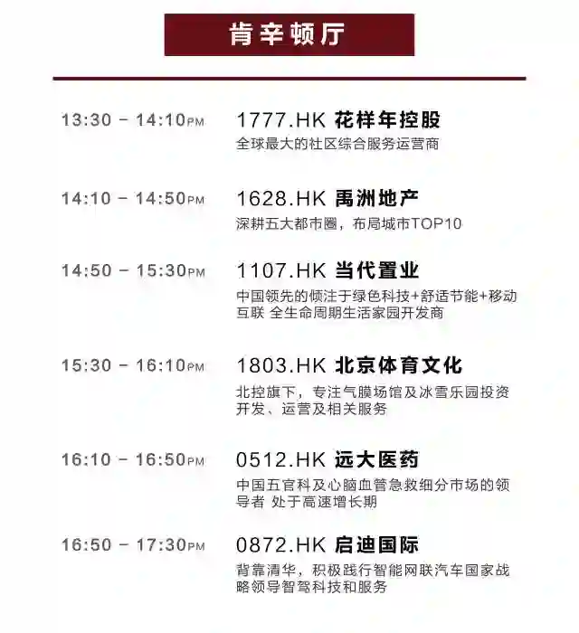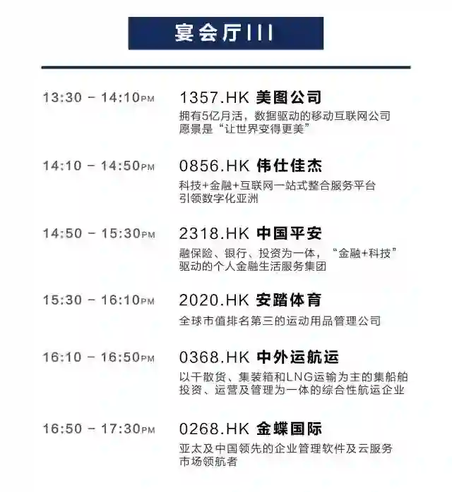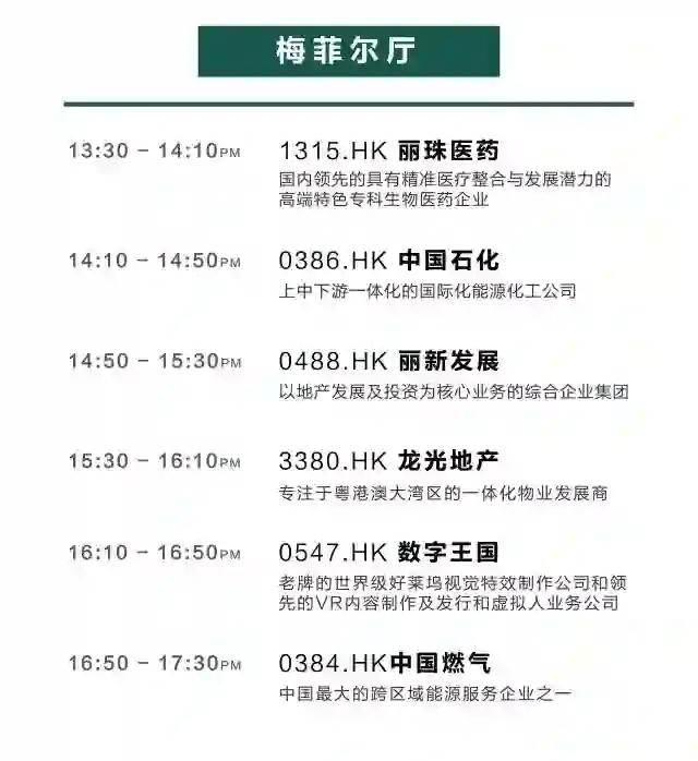 峰会首站,我们将带领36家优秀的上市公司汇聚一堂,每家公司将进行40分钟的路演及Q&A互动,各位机构投资者及高净值个人投资者将有机会与中国平安、中国石化、中国燃气、金蝶国际、龙光地产、安踏体育、康哲药业、丽珠医药、美图公司等广大投资者喜爱的港股上市公司,直接面对面沟通,我们将好公司,一网打尽。