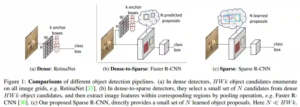 RetinaNet、Faster R-CNN 与 Sparse R-CNN 的比较。