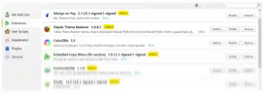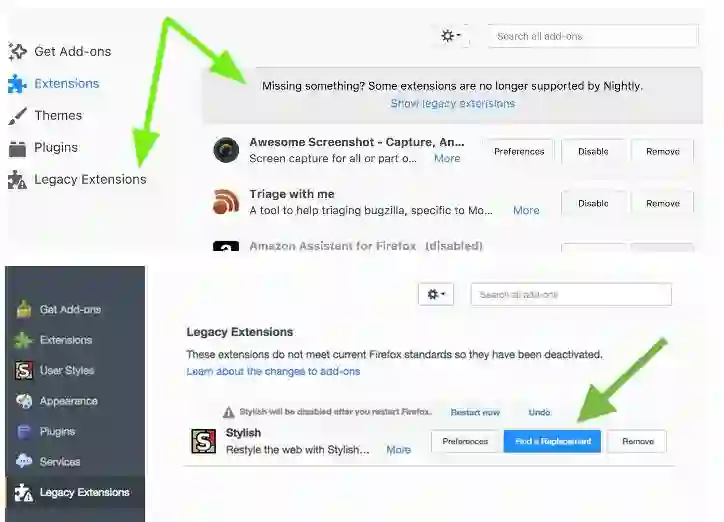 任何不是 WebExtension 的扩展都不能在 Firefox 57 中安装,或者如果已经安装了旧版的扩展,亦将被禁用。不过 Firefox 57 会为旧版的扩展提供可替代的解决方案。