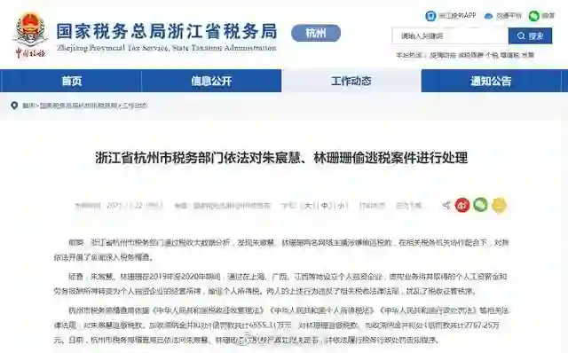 据新华社报道,从 22 日浙江省杭州市税务部门了解到,网络主播朱宸慧(微博 ID:雪梨 Cherie)、林珊珊(微博 ID:林珊珊_Sunny)因偷逃税款,将被依法追缴税款、加收滞纳金并处罚款分别计 6555.31 万元和 2767.25 万元。经查,朱宸慧、林珊珊在 2019 年至 2020 年期间,通过在上海、广西、江西等地设立个人独资企业,虚构业务将其取得的个人工资薪金和劳务报酬所得转变为个人独资企业的经营所得,偷逃个人所得税。两人的上述行为违反了相关税收法律法规,扰乱了税收征管秩序。