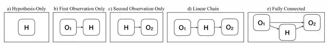 论文为αNLI制定了一套概率模型,这些模型对上述的公式进行了各种独立性假设,从一个完全忽略观测值的简单基线开始,然后建立一个完全联合的模型。这些模型在图2中被描述为贝叶斯网络。从理论上讲,“完全连接”模型可以将来自两个可用观测值的信息进行组合。