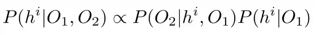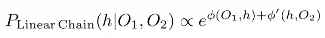 线性链:下一个模型同时使用两个观察值,但会独立考虑每个观察值对假设的影响,即它不会合并各个观察值的信息。形式上该模型假设三个变量<O1,H,O2>形成线性马尔可夫链,其中第二个观测值在给定假设下(即 (O1 ⊥ O2|H))有条件地独立于第一个观测值。在这种假设下,目标是使公式2稍微简单些(公式3):