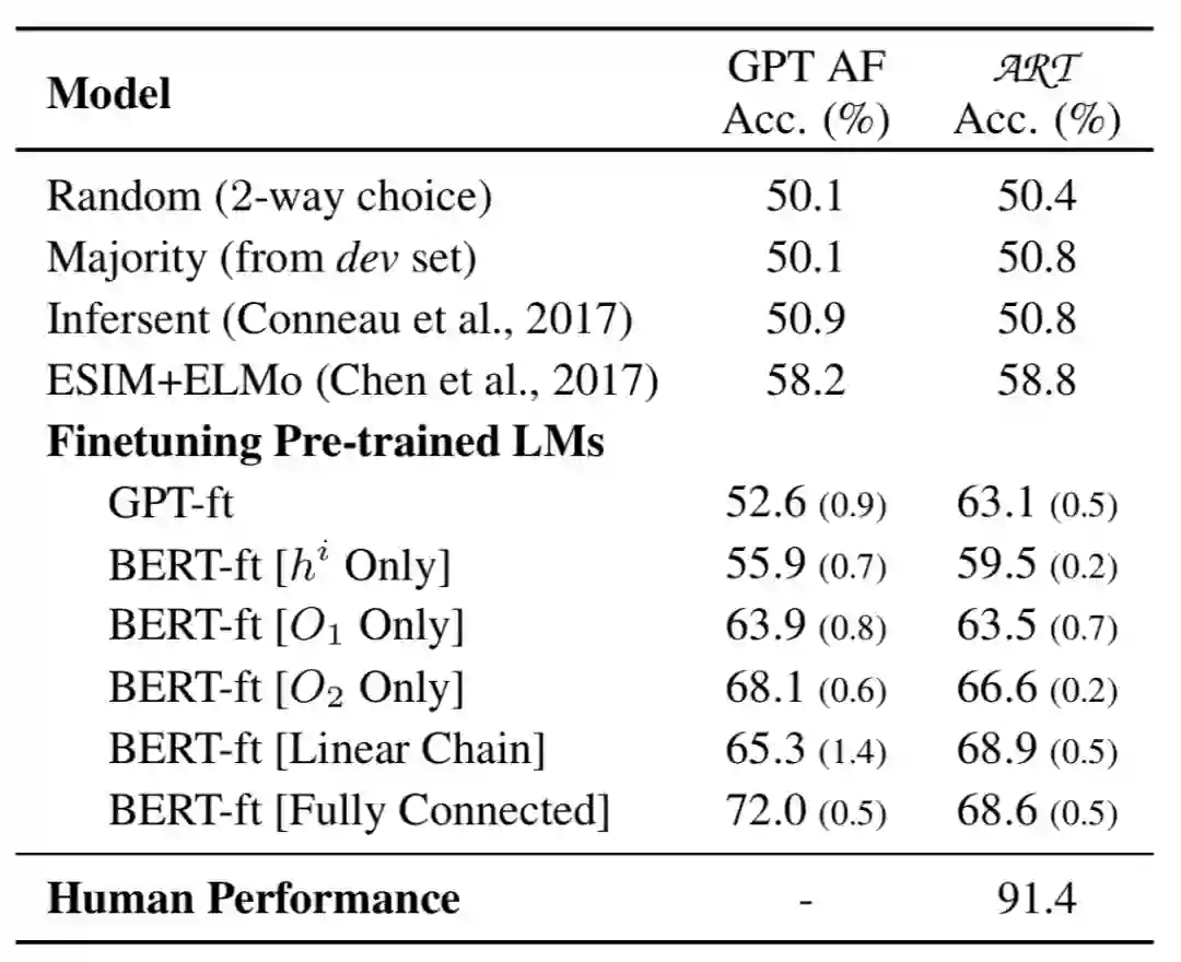 在ART数据集以及αNLI和αNLG的其他几个baseline上,对经过微调的的预训练语言模型进行评估。由于αNLI被构造为二进制分类问题,因此选择准确性作为主要指标。对于αNLG,报告了BLEU、CIDEr、METEOR(等自动化指标的性能,并报告了人类评估结果。