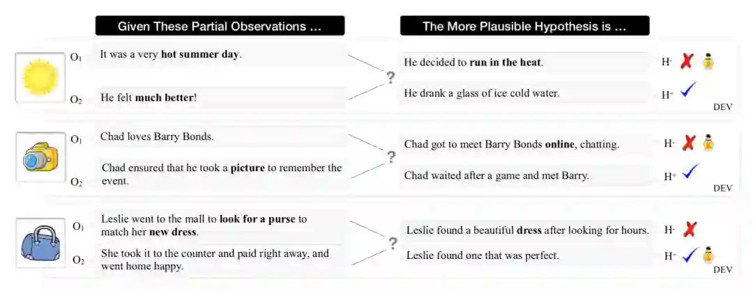 归纳(归因)自然语言推理:将αNLI公式化为由一对观察结果和一对假设选择组成的多项选择问题。ART中的每个实例定义如下: