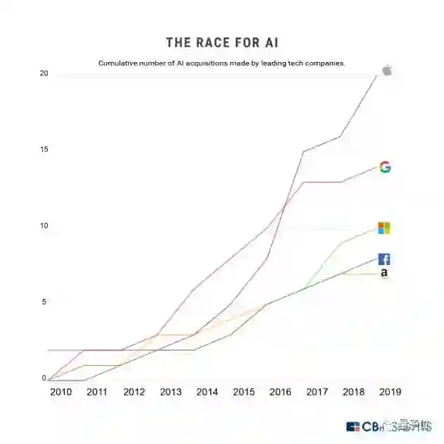 根据CB Insights数据统计,苹果在累计AI收购方面领先于谷歌、微软、Facebook和亚马逊。