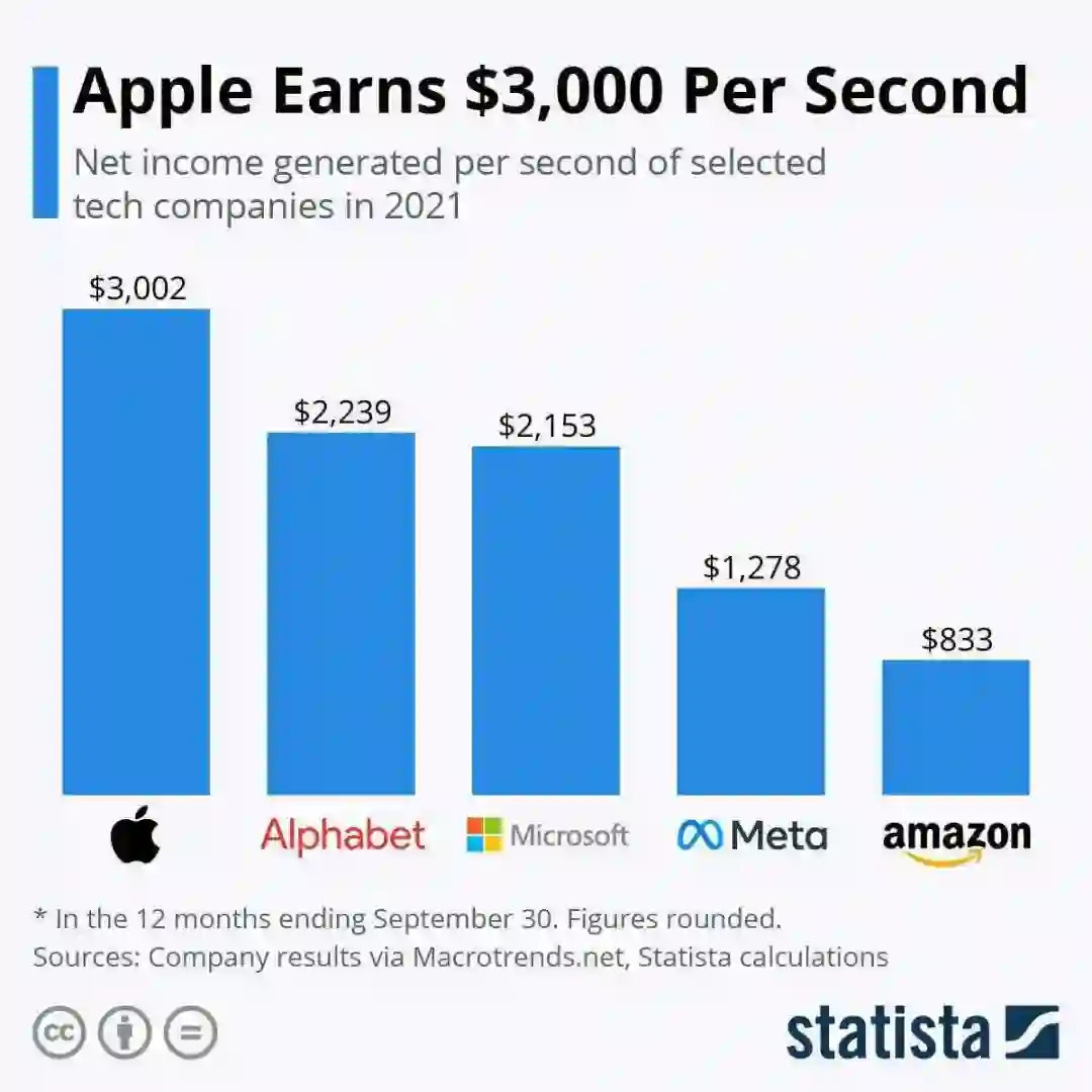 据数据分析机构 Statista 最新研究报告显示,苹果在 2020 年 10 月至 2021 年 9 月每秒净赚 3002 美元(约合 19177 元人民币),稳坐今年全球最赚钱公司宝座。接下来是 Google 母公司 Alphabet 和微软,每秒产生的利润分别为 2239 美元和 2153 美元。其次是 MetaPlatforms(FB.O)的 1278 美元和亚马逊(AMZN.O)的 833 美元。