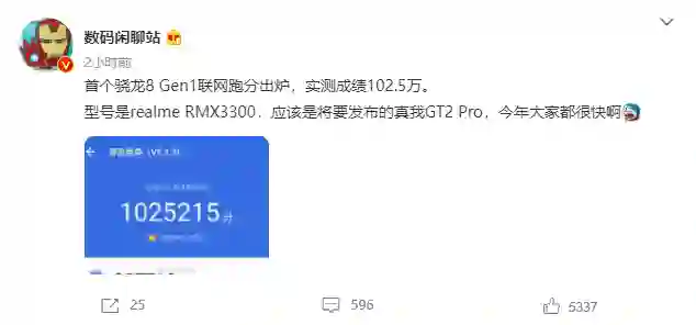 今日,数码博主 @数码闲聊站 微博晒出了首个骁龙 8 Gen1 的联网跑分,设备型号为 realme RMX3300,他表示这应该是即将发布的 realme GT2 Pro,跑分成绩为 1025215 分。