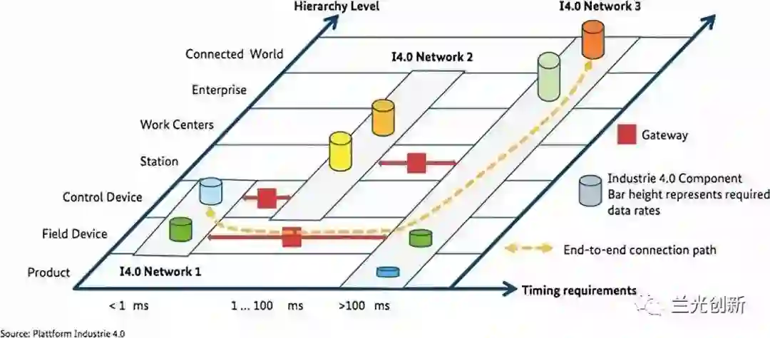 为了能以结构化的形式确切描述 RAMI4.0 通信层的相关要求、功能和接口,需要把基于网络的通信的模型设计为RAMI4.0 的扩展和补充。图 4 给出的两维模型中,一个维度是 RAMI4.0 中所谓的“递阶层级”及其包含的对通信的潜在要求;另一个维度是对通信的时间响应的要求。用在基于网络的通信中的不同的通信系统,在这两个维度都有描述。这些 不同的通信系统的区别在于它们被用于不同的递阶层级,因而对网络有着不同的时间响应要求。图4中用圆柱体表示工业 4.0 基本单元,这些工业4.0基本单元之间经由特定的网络相互通信。圆柱体的高度表示所要求的数据传输率。图中处在企业间通信( Connected World ) 层和企业层(Enterprise)的工业 4.0 基本单元,使用I4.0 网络3(即时间响应大于 100ms 的网络),它们的数据传输率的要求显然是很高的。而那些处于现场设备层(Field Device)和控制设备层(Control Device)的工业4.0基本单元,运用I4.0 网络 1(即时间响应小于 1ms 的网络),它们的数据传输率就很低。在这个模型中要点是连接不同网络的网关(图中用红色矩形表示),这种网关起到将公司内部的局域网连接到网络提供商的全球网络的作用。符合工业4.0要求的端对端的连接,就是通过网关在工业4.0网络内构成。
