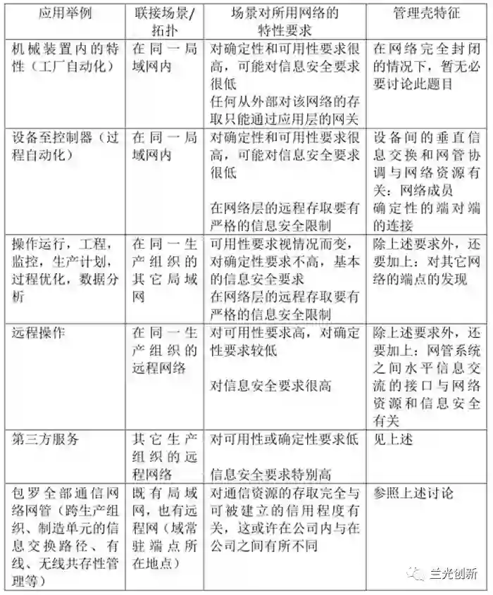 表2列举了工业4.0环境下主要的通信应用场景,包括工厂自动化FA、过程自动化PA、操作运营管理、远程操作、第三方服务以及包罗全部通信网络的网管。在典型的自动化应用中所呈现的这些场景,参照了所规定的具有基于网络通信能力的资产,如物理的或逻辑的通信网络、端对端的通信关系、任意管理壳的主体(即支持符合工业4.0通信的基本单 元)、网络管理和控制系统联接等等。这些场景的特点将会在管理壳中所需要的功能中体现。