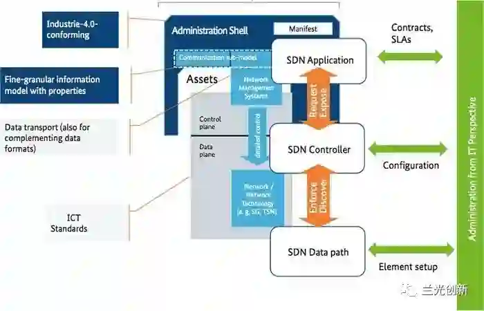图7示出的方法是在通过管理壳运行网络的概念模型中, 运用软件定义联网SDN的架构。图中可见,工业4.0的应用使 用网络通信管理壳与SDN控制器互动,在无需了解SDN技术的情况下,基本上完成SDN的任务。这样,工业4.0网络通信提供对网络管理服务的存取,而这个网络管理提供诸如网络发现、对其它网络的存取进行控制,以及处理链接要求等服务。从IT的角度看,管理壳中的通信子模型对应于SDN的应用,通信资产中的网络管理系统其下的控制层所执行的控制细节,相当于由SDN控制器承担;而数据层的任务由网络和标准的网络技术(如TSN)执行,这对应于SDN控制器与SDN 的数据路径之间的增强发现。