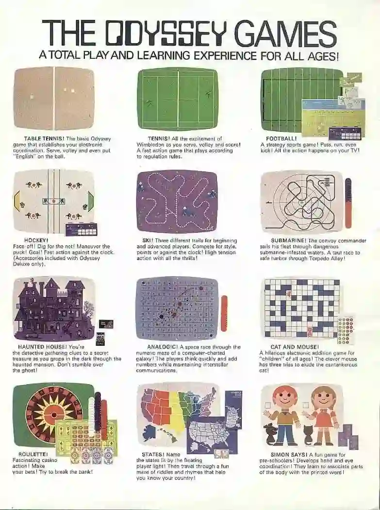 其实在游戏内容方面,奥德赛出厂就附带了 13 款游戏阵容,如它们的玩法一样,这 13 款游戏的名称也是非常简单明了,其中包括了西蒙说、网球、类比游戏、曲棍球、美式足球、猫捉老鼠、鬼屋、潜水艇、轮盘、滑雪等。独立发售和随光线枪发售的游戏分别为 6 款和 4 款,它们是有趣动物园、棒球、侵略、向前冲、排球、脑电波,光线枪游戏为史前野生动物园、狗斗、枪战、射击场。