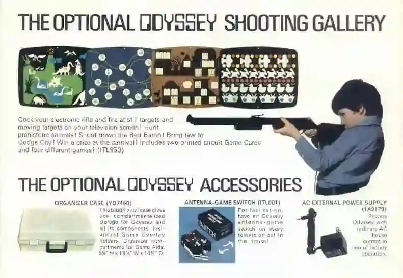 奥德赛光枪类游戏的玩法大同小异,《野生动物园》、《狗斗》、《枪战》、《射击场》四款游戏均使用附带的光枪进行操控,其中《狗斗》是指空战中两部飞机在空中较量,谁先攻击到飞机的机尾即可获胜。不过有一个有趣的小知识点,其实奥德赛这款光枪的枪管部分是由任天堂生产的,可想而知任天堂在当时已经拥有一定的技术积累,尤其在光线枪领域拥有绝对的技术优势,只不过任天堂的第一款“红白机”FC 游戏机 1983 年才在日本正式推出。