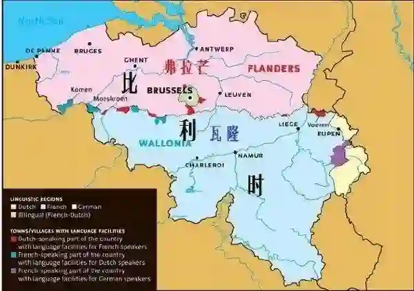 比利时全国可以被大致分为四个地区,通行三种不同的语言:北部靠近荷兰的弗拉芒地区,官方语言是弗拉芒语(可认作是荷兰语的一种方言);南部挨着法国的瓦隆地区,通用瓦隆语(与法语差别极小);还有一小块从德国获得的领土,民众说德语。