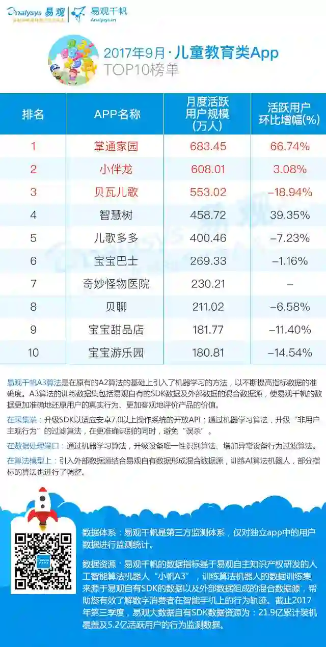 2017年9月,儿童教育类App TOP10榜单中活跃用户环比正向增长的App有3个,开学季后,儿童教育领域月活有所回落,但整体保持稳中求涨态势。
