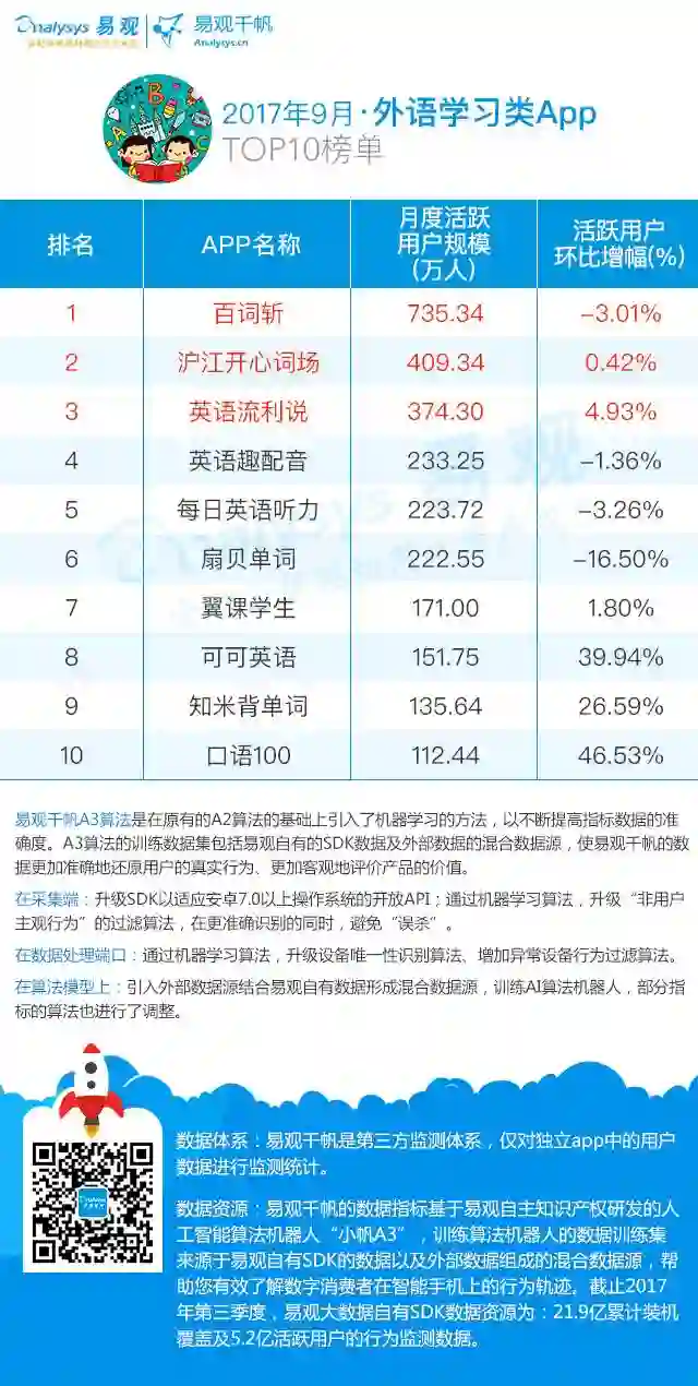 9月榜单中,百词斩以735.34万活跃用户规模位居榜首,月活用户规模有所回落。百词斩在本月中保持自身整体排名,通过其内容和形式优势占据较大的用户粘性。口语100表现不俗,以46.53%的增幅在外语学习TOP10一片低迷之中令人称赞。口语100是主要面向中小学生的英语口语教育应用,给每个学生一个口语陪练,在音节层次上纠正口语发音,并配套各类中小学教材,让孩子的英语教材更灵活。