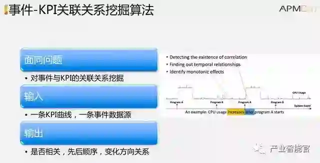 另外就是事件和KPI的关联关系,比如程序启动的事件,在某个时间点程序A启动了,下个时间点程序B启动了。在程序A每次启动的时候CPU利用率就上了一个台阶,而B没有,所以说事件和曲线的关联关系,还包括先后顺序、变化方向。 常用基本算法包括Pearson 关联分析, J-Measure, Two-sample test等。