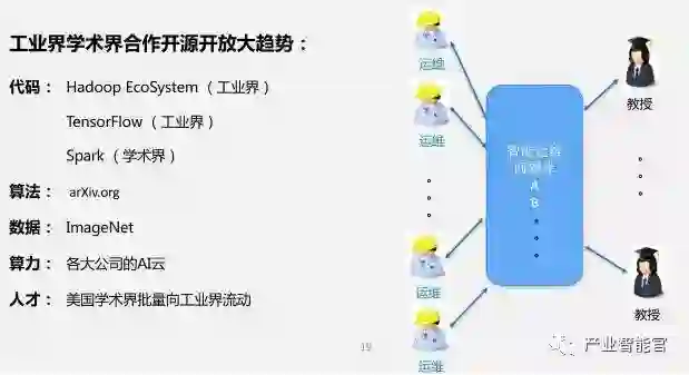 开源开放的大趋势已经对工业界和学术界产生了巨大的影响。大家耳熟能详的Hadoop、Ecosystem、TensorFlow等,都是开源开放的产物。在算法层面,当前有arXiv共享算法(论文)平台,和Github代码共享;在数据层面,ImageNet等数据共享平台对机器学习算法的研究起到了巨大的推动作用;在计算能力层面,各大公司都建立了AI云;在人才层面,我们也可以看到,学术界和工业界的人才流动比原来顺畅多了。