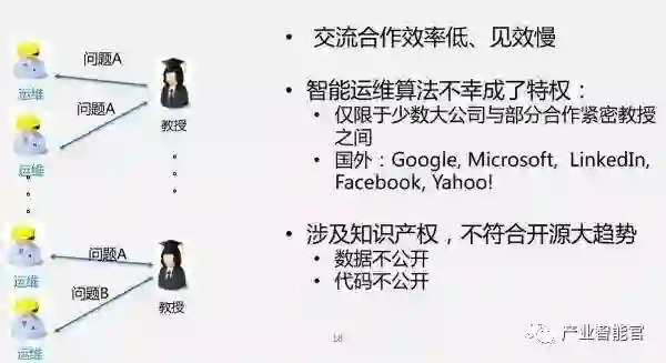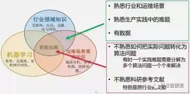 第三,虽然工业界熟悉运维行业和场景,熟悉生产实践中的挑战,也有数据。但是,工业界并不熟悉整个智能运维中最重要的部分——如何把实际问题转化为算法问题(后面会讲到如何把实践 中的难题分解成多个算法并逐个解决)。同时,工业界也不太熟悉查阅科研文献,特别是跨行业的文献。因此,智能运维是一个需要三方面领域知识结合的高门槛领域。