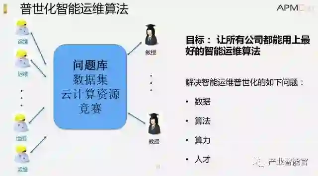 这一思路受到了斯坦福教授李飞飞的影响。她最近在宣传普世化AI的思路——让所有人都可以使用AI。李飞飞教授建立的 ImageNet上面有1000多万张图片的分类标注数据。在2012年Hinton教授提出了一种基于CNN的图片分类算法,取得比以往最好结果高好几个百分点的结果, 引起了深度学习的复兴。现在,她同时兼任Google机器学习部门的负责人。她在宣传普世化AI思路时,提到普世化有四个基本点:计算能力、数据、算法、人才。这四个基本点跟我们要落地智能运维所遇到的挑战是一样的。 因为我们也需要用到机器学习和AI的技术来解决智能运维中的挑战性问题。