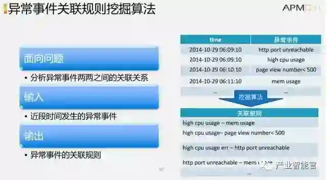 上图是故障传播链,当应用层、业务层发生故障的时候,如果有故障传播图,就可以从中找到对应时间范围内的相关事件。如果有就沿着传播链继续往找,直至找到根因。我们希望能得到这样的故障传播图,但是很多软件之间的模块关系很复杂,很难描述。另外,刚才提到的调用关系,即A模块调B模块,并不代表A发生异常就会导致B发生异常,而是还有很多其他的因素。 通过机器学习算法挖掘各种关联关系,再辅以模块调用关系链,则构建准确完整的调用关系链就相对比较容易了。 挖掘关联关系包括之前阐述过的KPI聚类,KPI关联分析,下面我们再讲述另外的两个算法。
