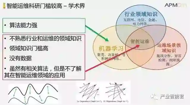 虽然学术界研究人员的算法能力相对较强,但是他们往往不熟悉行业和运维领域的相关知识。而智能运维处于三个领域的交叉部分。这就导致智能运维的门槛比较高,需要花大量的时间和精力才能进入智能运维领域。