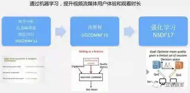 这是一位CMU教授的系列文章。这位教授在一个做视频分发的创业公司做了若干工作。2011年,他在学术界发表了一篇文章。这一工作比较简单,主要为了提升用户观看流媒体的体验,其中用到了相关分析、线性回归、信息增益等简单算法。2013年,该教授基于网络行为数据和性能数据,使用决策树方法预测用户的观看时长。该教授于2017年发表了一篇新的文章,将视频质量的实时优化问题转化为一种基础的强化学习问题,并使用上限置信区间算法有效解决了这一问题。