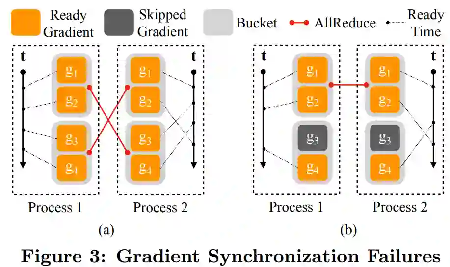 下图 3(a)的示例中,两个竖直轴表示时间,虚线代表梯度准备就绪的时间。进程 1 中,4 个梯度按顺序计算。进程 2 中,g_2 在 g_3 和 g_4 之后计算;图 3(b)的示例中,梯度 g_3 对应的参数在一次迭代中被跳过了,导致 g_3 的就绪信号缺失。