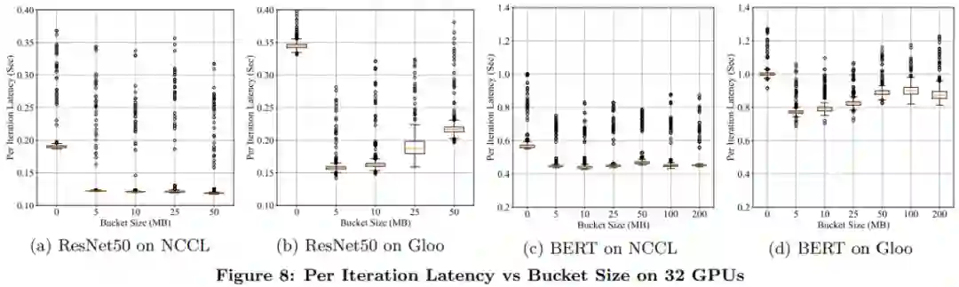 为了验证通信重叠计算的有效性,下图 6 展示了 ResNet50 和 BERT 模型分别使用 NCCL 和 Gloo 反向传递时的延迟故障。所有实现都用到了 4 台服务器上的 32 个 GPU。