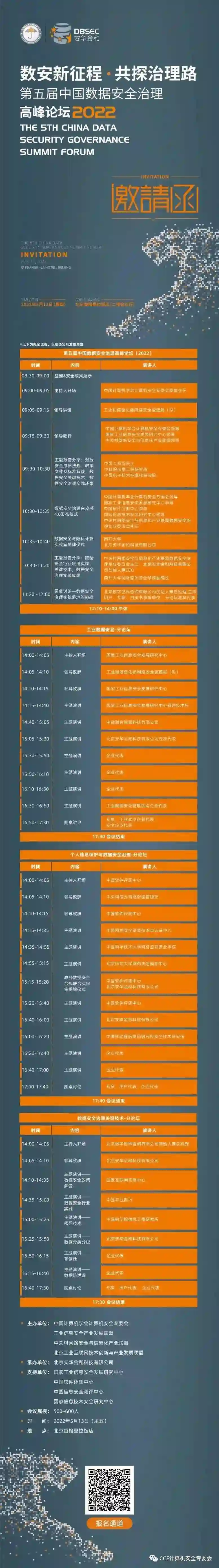 5月13日,以“数安新征程· 共探治理路”为主题的第五届中国数据安全治理高峰论坛将于北京香格里拉饭店举办。