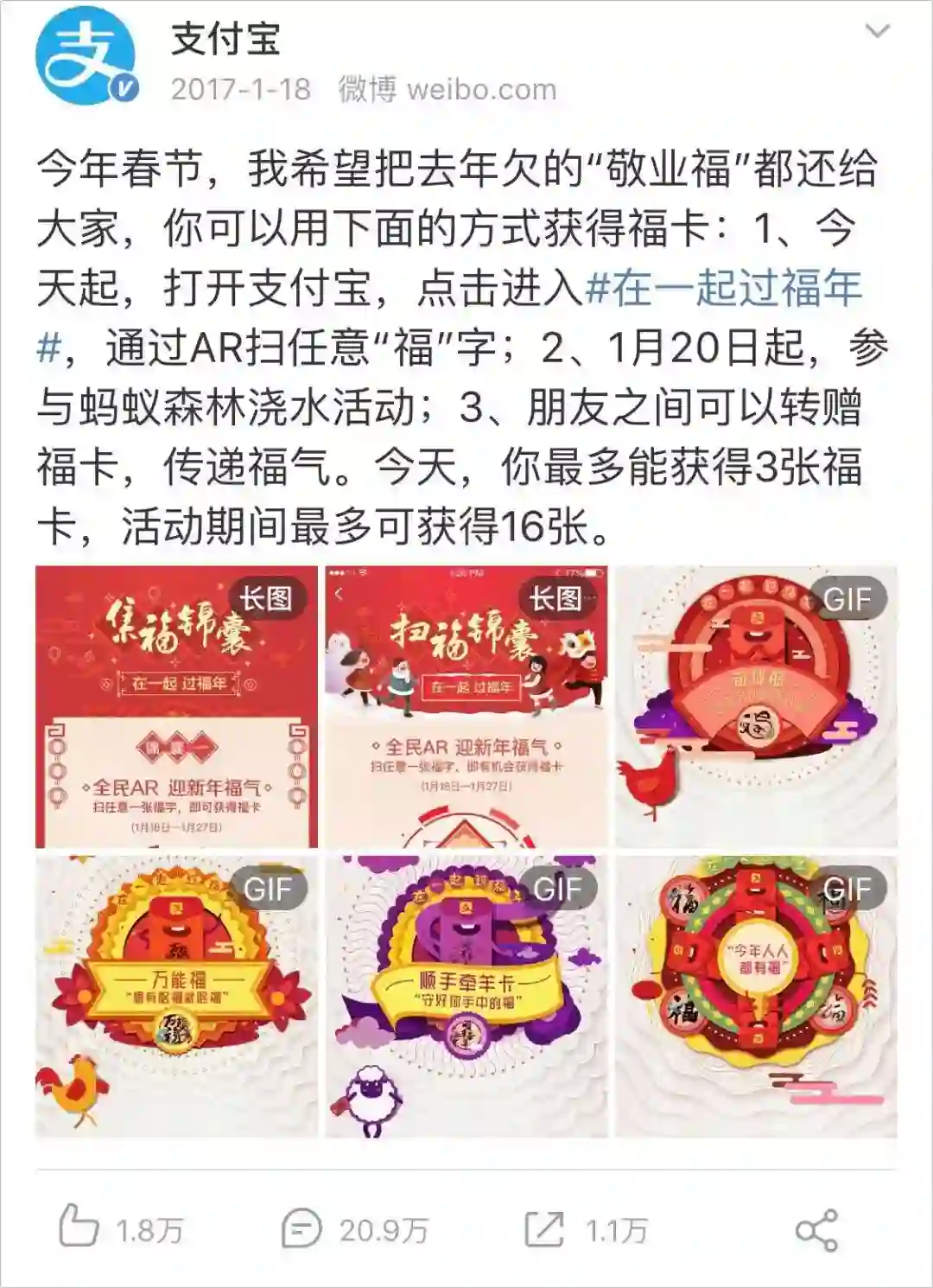 2017 年,AR 技术加入集福,敬业福不再稀缺。可以通过扫“福”字、蚂蚁森林浇水获得福卡;此外,还增加了“万能福”和“顺手牵羊”卡(后被取消),“万能福”可以替代任意的福。