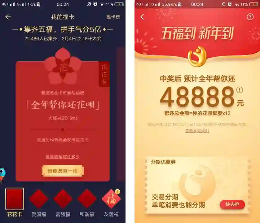扫五福的时候,会随机蹦出来这个花花卡。有了这个卡,就可以参与抽奖啦!据说除夕当晚会从有花花卡的人里面选 2019 个幸运儿,支付宝可以免费帮还一年的花呗!