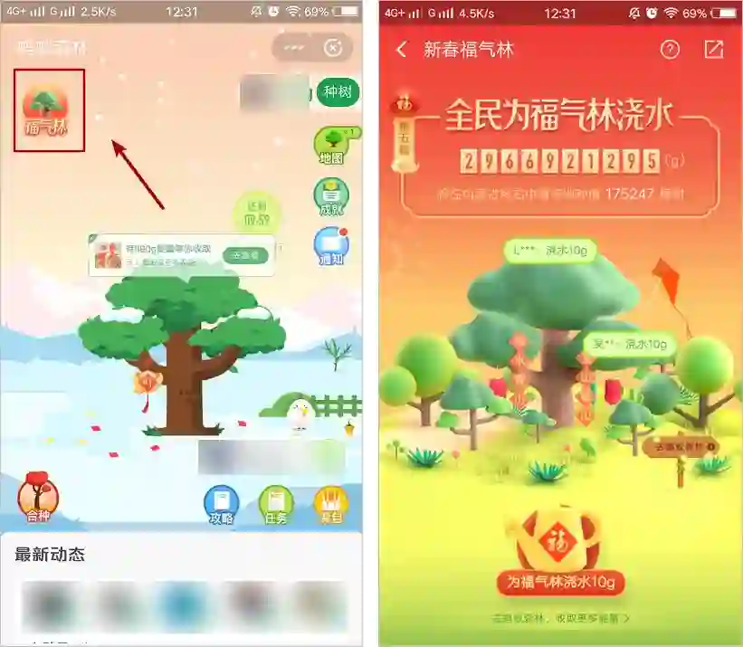 开通蚂蚁森林,进入蚂蚁森林里面的福气林,给福气林浇水就有机会获得福卡。不同于往年的给好友浇水得福卡。