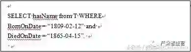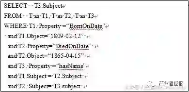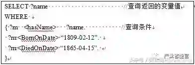 面向RDF数据集,W3C提出了一种结构化查询语言SPARQL;它类似于面向关系数据库的查询语言SQL。和SQL一样,SPARQL也是一种描述性的结构化查询语言,即用户只需要按照SPARQL定义的语法规则去描述其想查询的信息即可,不需要明确指定如何进行查询的计算机的实现步骤。2008年1月,SPARQL成为W3C的正式标准。SPARQL中的WHERE子句定义了查询条件,其也是由三元组来表示。我们不过多的介绍语法细节,有兴趣的读者可以参考[1]。下面的例子解释了SPARQL语言。假设我们需要在上面的RDF数据中查询“在1809年2月12日出生,并且在1865年4月15日逝世的人的姓名?” 这个查询可以表示成如图2的SPARQL语句。