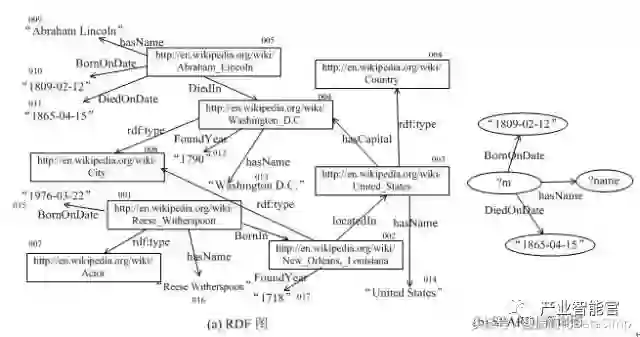 我们也可以将RDF和SPARQL分别表示成图的形式。例如在RDF中,主体和客体可以分别表示成RDF图中的节点,一条称述(即RDF三元组)可以表示成一条边,其中谓词是边的标签。SPARQL语句同样可以表示成一个查询图。图3显示了上例所对应的RDF图和SPARQL查询图结构。回答SPARQL查询本质上就是在RDF图中找到SPARQL查询图的子图匹配的位置,这就是基于图数据库的回答SPARQL查询的理论基础。在图3例子中,由节点005,009,010和011所推导的子图就是查询图的一个匹配,根据此匹配很容易知道SPARQL的查询结果是“Abraham Lincoln”。