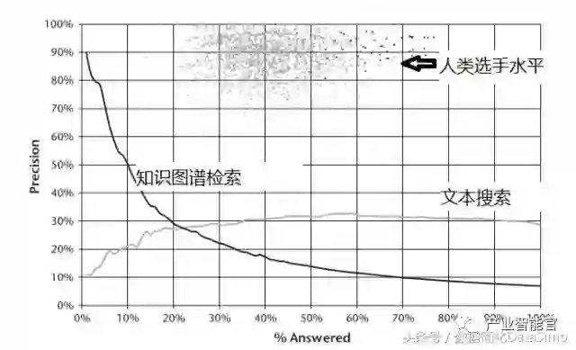 面向知识图谱的问答系统还包括Amazon收购的EVI产品。EVI的原名叫True Knowledge[29],是一家创业公司的产品。本质上就是用三元组的形式来组织数据,根据模板技术将用户的自然语言问题转化为结构化的查询语句找到结果返回给用户[29]。IBM的Watson系统中也同样采用DBpedia和Yago知识图谱数据来回答某些自然语言问题[3];相比于传统基于文档的问答方法,基于知识图谱的问答其准确度更高,但是这样方法所能回答的问题相对较少。例如图9给出了IBM的Watson系统中利用知识图谱检索可以回答的问题的覆盖面小于传统利用文本搜索的覆盖率,但是利用知识图谱进行问答其精确度要高得多。