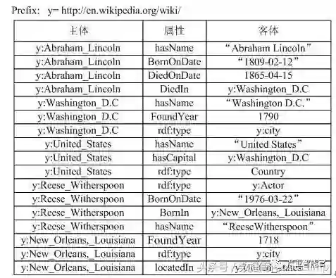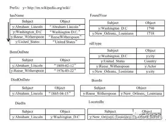 下图1展示了一个人物类百科的RDF三元组的知识图谱数据集。例如y:Abraham_Lincoln表示一个实体URI(其中y表示前缀http://en.wikipedia.org/wiki/),其有3三个属性(hasName,BornOndate,DiedOnDate)和一个关系(DiedIn)。