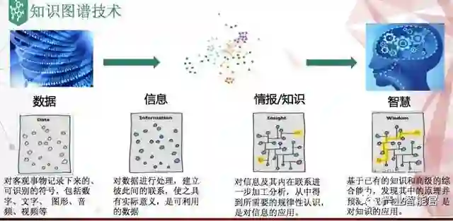 以技术方面为例,知识图谱是从数据、情报到知识,最后再到智慧的过程。