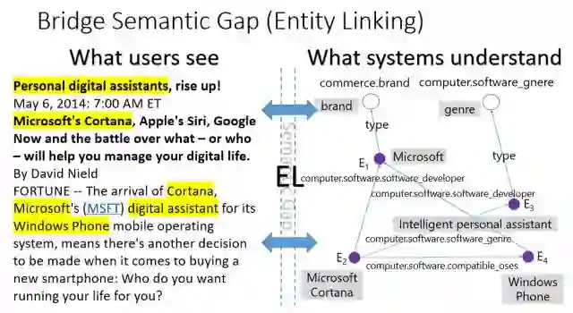 所以,机器跟人之间的沟通或者是机器要去了解这个世界的时候,它有一个语义的鸿沟。我们还有个技术叫实体链接,比如文章里有“微软的Cortana”,这个短语里包括了两个实体,一个是微软,一个是Cortana。以前在做自然语言处理的时候,我们说这是一个名词词组,不需要了解里面讲的是微软还是什么,它就是个专有名词,Cortana也是一个专有名词。但人理解的时候,我们不是只知道它是什么词性的,我们知道微软是代表一个公司,Cortana是微软公司的一个产品。