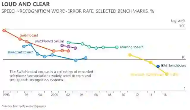 第二,让机器能够听。学术界在评价技术的进步与否时都有一个标准的测试集。看看下图的这些线,每个点都是一个语音识别测试数据的结果,线越往下就表示做得越好,错误率低。可以看到最右边的这条线,微软去年做的错误率在5.9%左右,5.9%已经达到了人类水平。